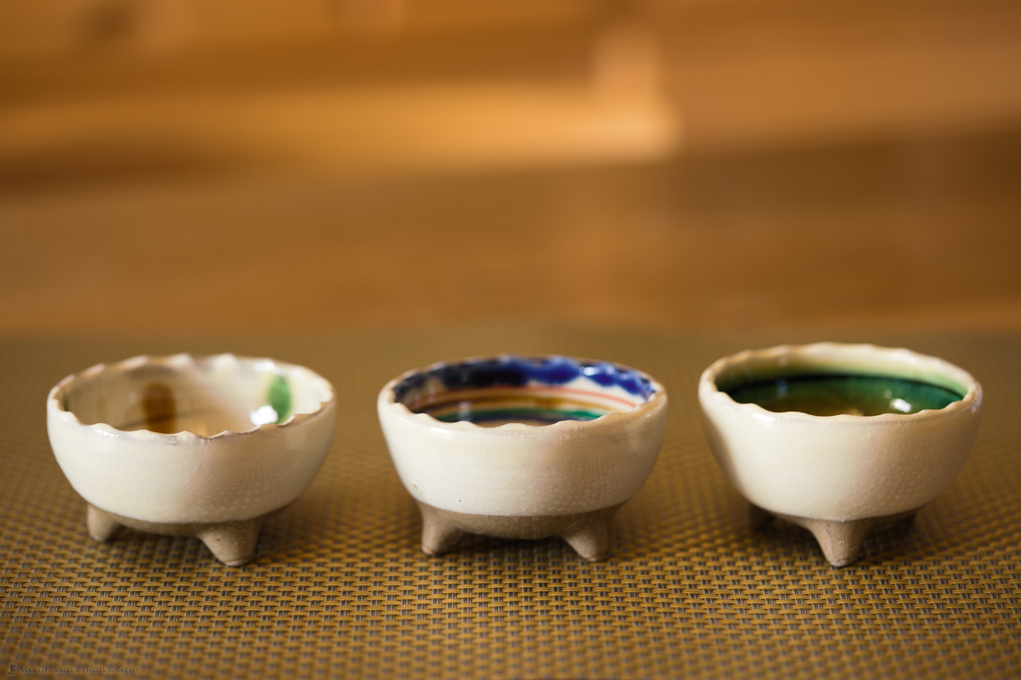Anyway, I have selected 15 images, though not all of them will have anything special to add, so I’ll break my usual 10 photos per episode rule and we’ll blast through all fifteen today. Here is the first photo that I shot of three of my favorite sake cups, otherwise known as “Guinomi”. Guinomi is usually used to describe a slightly larger sake cup, and the name is related to a hearty drinking style. “Ochoko” is another word for a sake cup that you may have heard, but they are usually slightly smaller, and used to drink sake in a more refined and gentle manner. It’s kind of like the difference between guzzling and sipping the drink. Personally, I prefer the former drinking style, and that’s why I have these Guinomi.