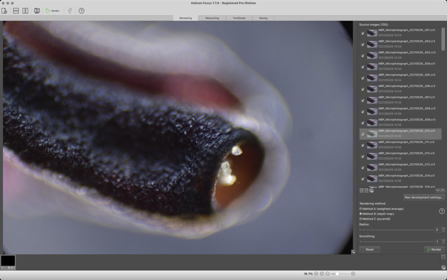 Before we start using Helicon Focus, once again, there are a few settings that we need to tweak. First of all, for the best image quality, I’m using the Raw in DNG out workflow in Helicon Focus. I also recommend using ProPhoto RGB as the working color space, and both of these settings can be accessed by selecting the Raw Development Settings button in the bottom right corner of the main screen in Helicon Focus. Having done some tests on the various Rendering Methods, with my relatively poor quality camera adapter, I’m finding that Method B with the Radius set to 3 and the Smoothing set to 1 is giving me the best results. You’d need to find the best settings for your own gear, and I imagine if you had a better camera adapter, you could increase both of these numbers some and get more pleasing results.