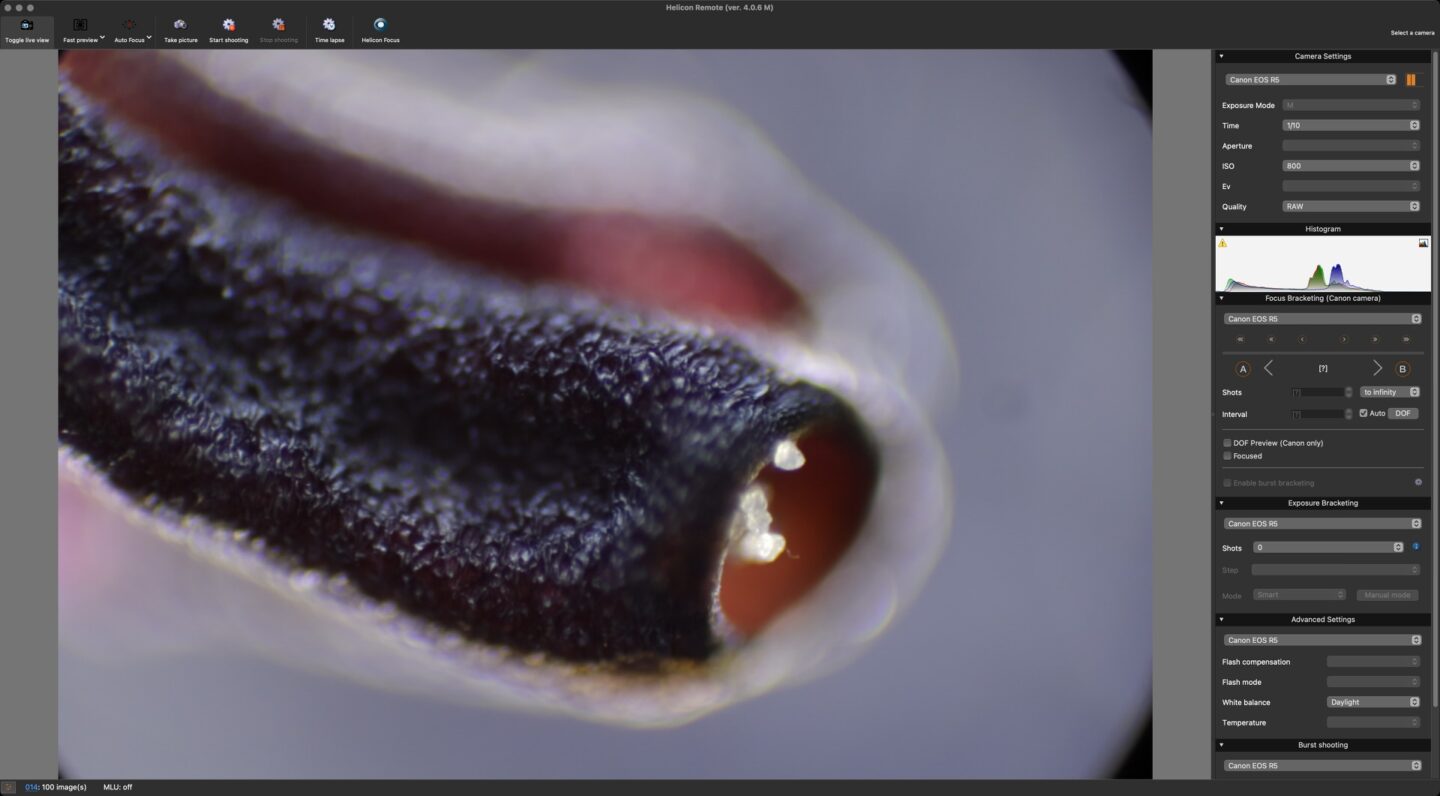 Helicon Remote also has a host of features for finding the optimal number of images per stack and automatically adjusting the focus distance to move through the stack, but because I’m using an adapter with no way to adjust the focus of my microscope, I’m working in manual with regards to focusing. I have found it very useful to be able to see adjust things like the shutter speed and the ISO from the sidebar in Helicon Remote, but apart from that, it’s really just a matter of focusing and releasing the shutter once it’s all set up as I just mentioned.