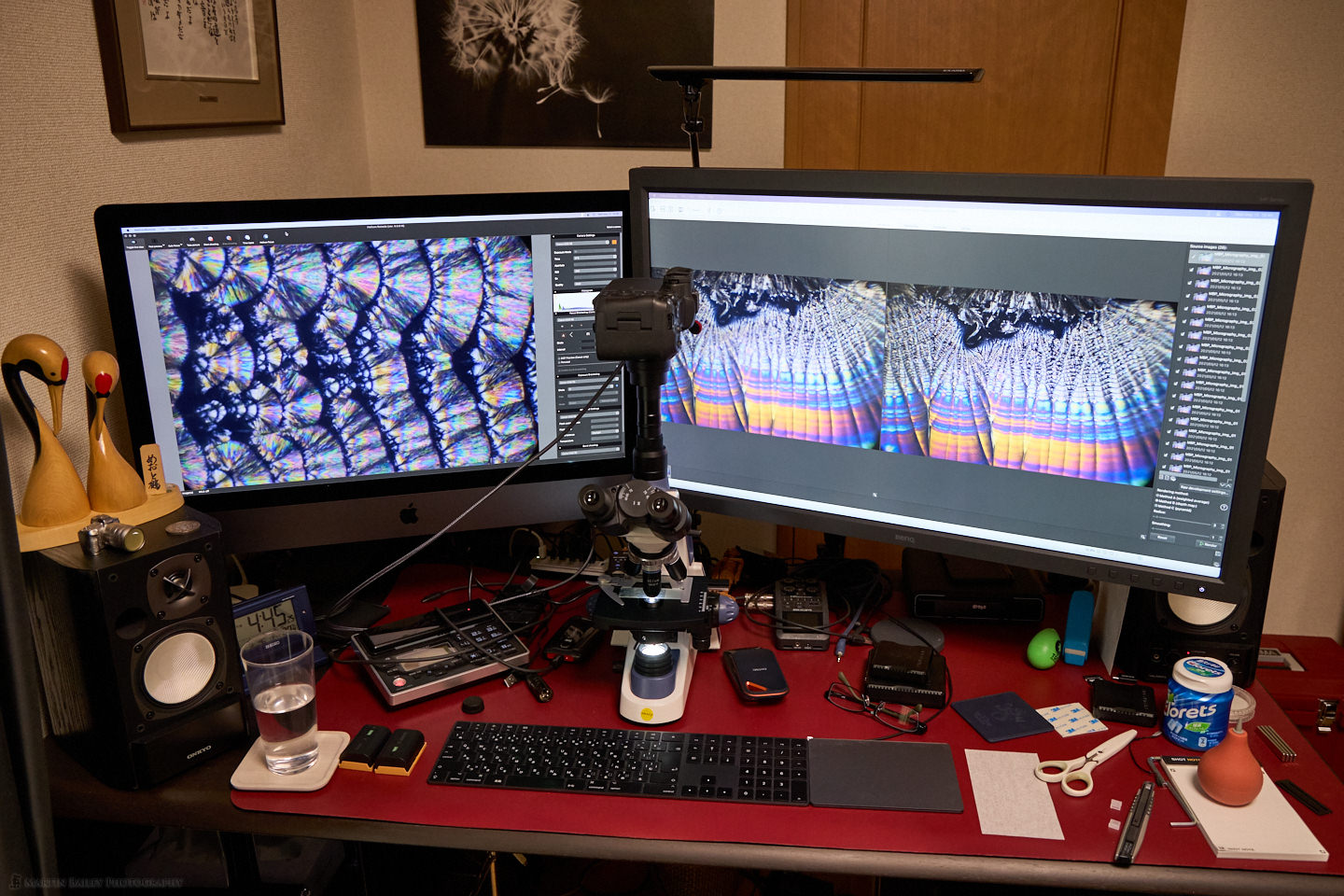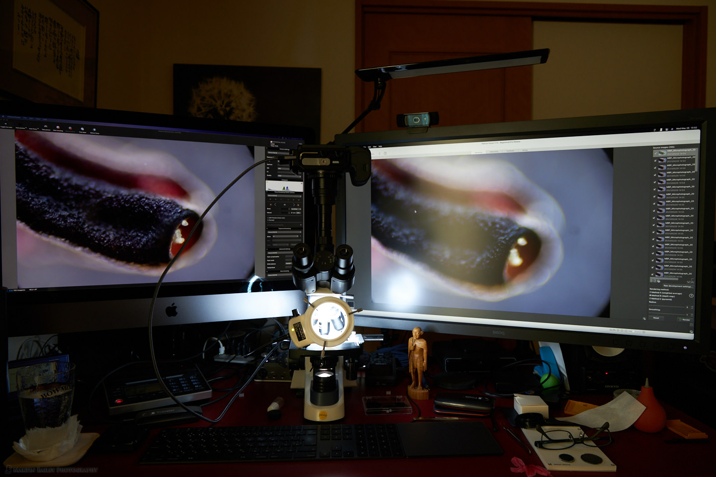 OK, so let’s talk about the workflow now, starting with a photo of my main desk which is where I’m doing my microphotography with the Microscope in the middle of the desk. As you can see, I am able to rotate the camera in the adapter, so I can choose the angle that I want to shoot at very freely. On my screens there, you’ll see Helicon Remote on the left screen, which is in the middle of shooting a new stack of images, and Helicon Focus on the right screen, working on stacking the previous set.