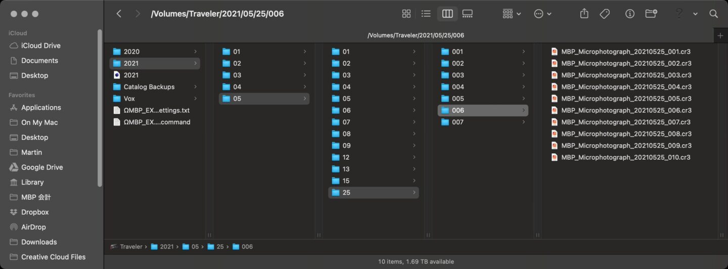 Note too that I have set Helicon Remote up to move Raw and JPEG files to my computer, but to just copy movie files, leaving a copy on the camera’s memory card as well. These settings have been working well for me, and result in Helicon Remote automatically creating the folder structure that you see in this next screenshot, completely automatically as I shoot.