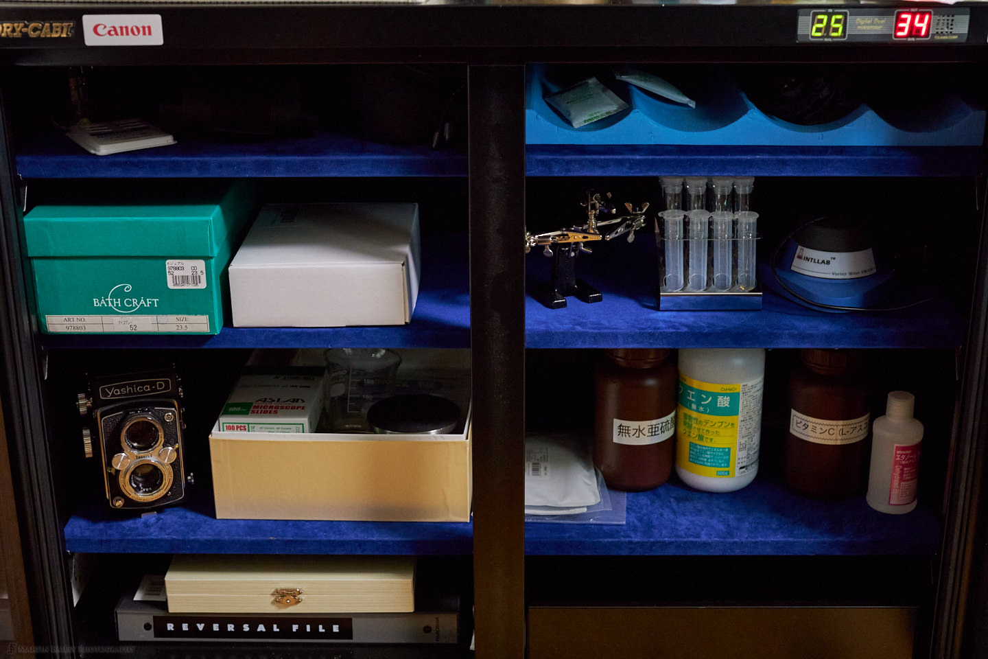 I have a very shallow shelf between the two shelves in the last two photos on which I’ve stored my filters and macro rail etc. Back in my old Dry-Cabi, you see that apart from my old Yashica TLR camera, I have pretty much filled it with stuff that I’m using for my microphotography. The Vortex mixer that you can probably just make out to the right of the middle shelf there, has a rubber cover on the top that you push the test-tube down on to mix its contents, and I’m pretty sure that if I left this out in the heat and humidity of the Tokyo summer, that rubber would go all sticky and probably completely break down over the course of one or two years. The chemicals and things like citric acid that I’ve bought also won’t fair well in the humidity, even though I have put them in relatively well sealed containers.
