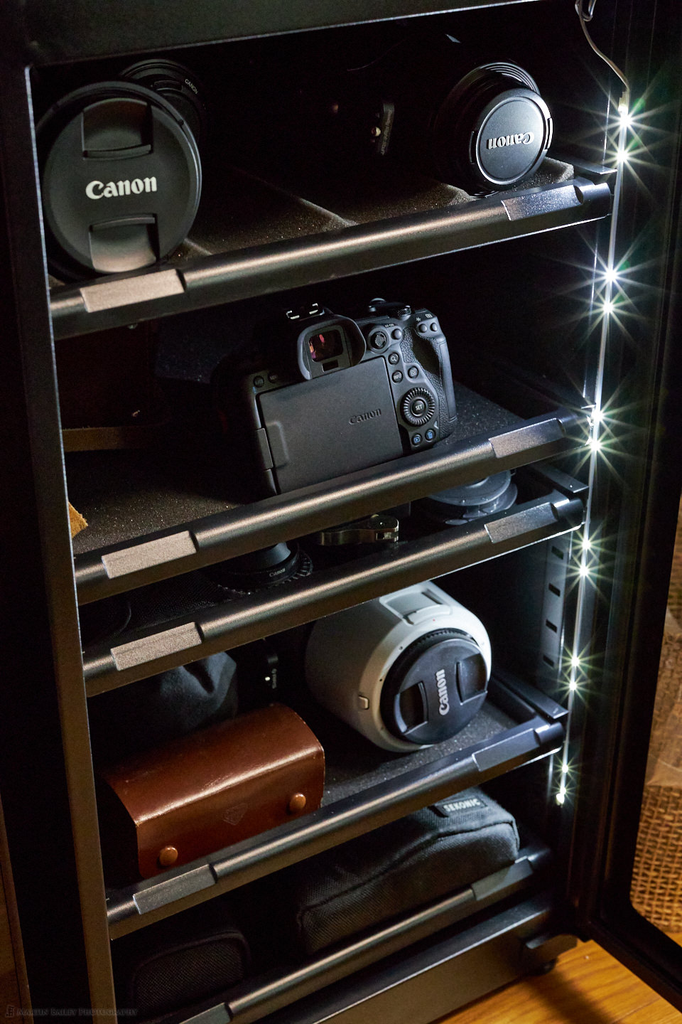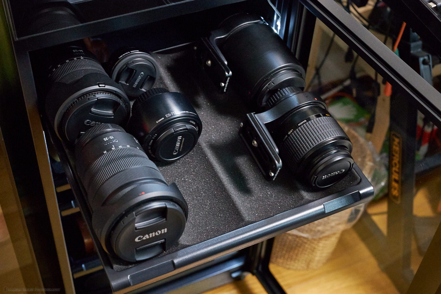 Also, note the fancy LED lights along the right front edge of the cabinet. These help to see what’s in the cabinet to a degree, so they are more than a marketing gimmick that I’d initially expected them to be. In the below-left photo, you can also see the bottom compartment of the cabinet. The top compartment is about two-thirds the height of the bottom section. The thing that I really like about the new cabinet is that the shelves all pull out pretty much completely, allowing me to place lenses behind each other, rather than having just one lens on each row, which is how I used my Dry-Cabi. This really helps to place your gear very efficiently, though the lens feet on my two macro lenses take up an extra row, and I’ll try to figure out what to do about this at some point.