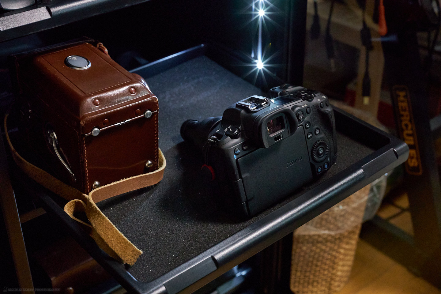 I’m keeping my three main camera bodies on the next shelf down, and you can see my EOS R5 sporting my microscope adapter at the front of this shelf, and my Rollieflex to the left. My EOS R has been living in the back-right corner with the 50mm ƒ/1.2 lens attached, as I often grab that to get shots like these for the blog etc. In the right photo below you can see my Rollei filter case, my Canon RF 100-500mm lens and the two RF mount Extenders, as well as some RF mount extension tubes that I picked up and will report on at some point soon. I found it interesting that the third-party manufacturers beat Canon to the market on the Extension Tube front.
