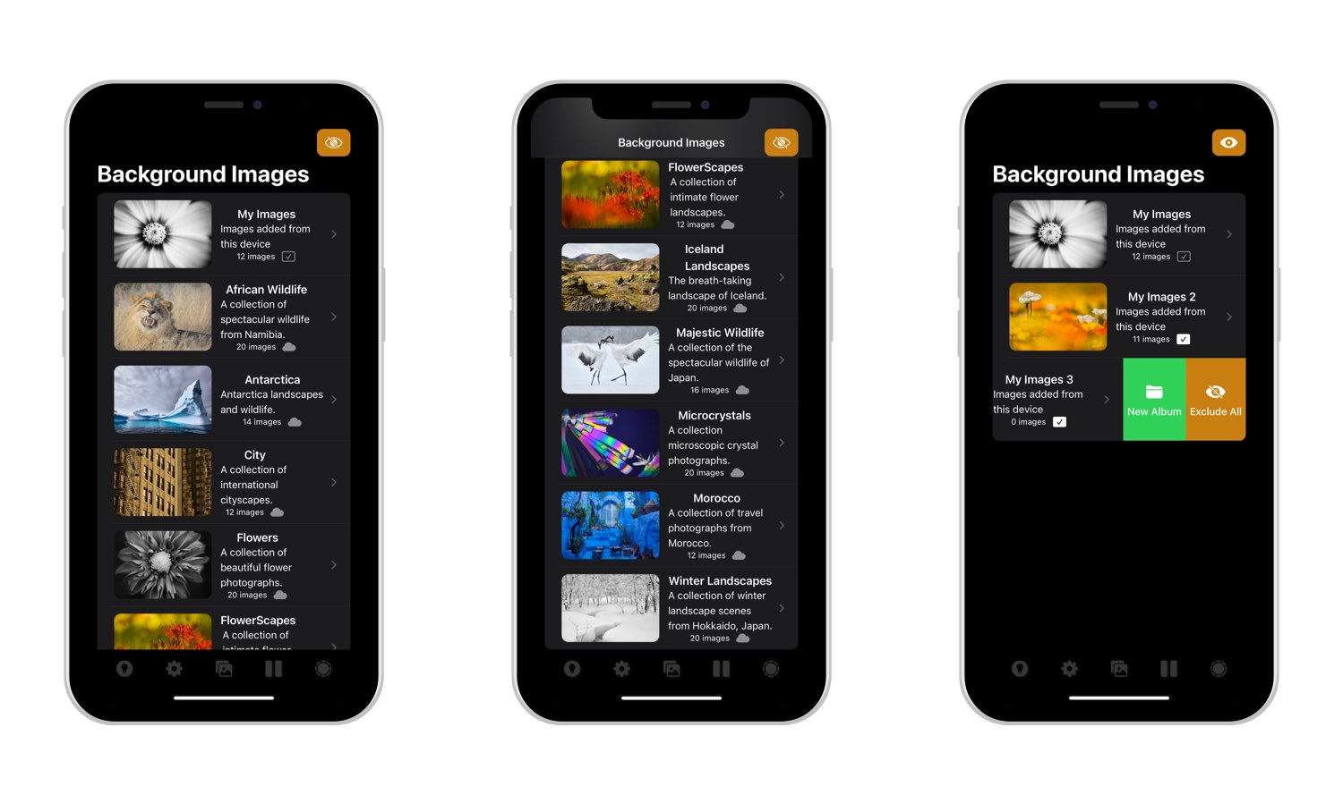For many years I’ve wanted an app that does what PhotoClock Pro does, which is in essence, to provide an analog clock on my iPhone or iPad screen and display images behind the clock. The basic design was relatively easy to complete, but as I worked on PhotoClock Pro I started to want more and more features, and have actually added one more feature already since submitting version 1.0 for review, and I’ll show you that shortly as well. The In-App Purchases that I’ve added currently amount to ten Background Image Packs of my own photo that you can buy for between $2.99 and $5.99, depending on the number of images in the pack. These are completely optional and can be hidden too. The base price, which I’ve currently set at $7.99 gets you the fully functional app. So as not to fill your iPhone with my images even if you never use them, apart from multiple app icons that you can choose from, there are no images actually stored inside PhotoClock Pro when you buy it. They are downloaded after you buy them and stored within the app at that point. Even the icons for the Background Image Packs are only downloaded as you need them. Here is a series of three screenshots that I’ve captured to show you the ten image packs that I’m launching with, and you will also notice a My Image folder at the top of the list. If you don’t want to see my image packs, just tap the eye icon in the top right corner and they’ll collapse away, leaving just the user albums visible. We start off with one album for you to load your own image into, but as you can see in the right-most of the three screenshots, you can slide the albums to the left to reveal an option to create a new album. When you no longer need an album, you can slide it to the right to delete the album and all of the images inside it.