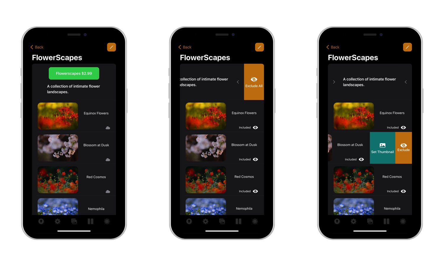When you tap on an album you go inside to see a list of thumbnails showing what each image looks like and provides a few more options via the management panel at the top of the list and by sliding the images themselves. In the user albums, if you tap the pen in the top right corner you can edit the album name and description, to help you organize your albums as I’ve organized the image packs. If you enter an image pack that you don’t yet own, you will see a button at the top of the list to buy the pack, as you can see in this screenshot of my FlowerScape pack. Note too that there is a cloud icon below each image title showing that the cloud is not yet downloaded. Once you buy an image pack it will be automatically downloaded and all images marked as Included, meaning that they will be included in the slideshow behind the clock, which we will get to very soon.