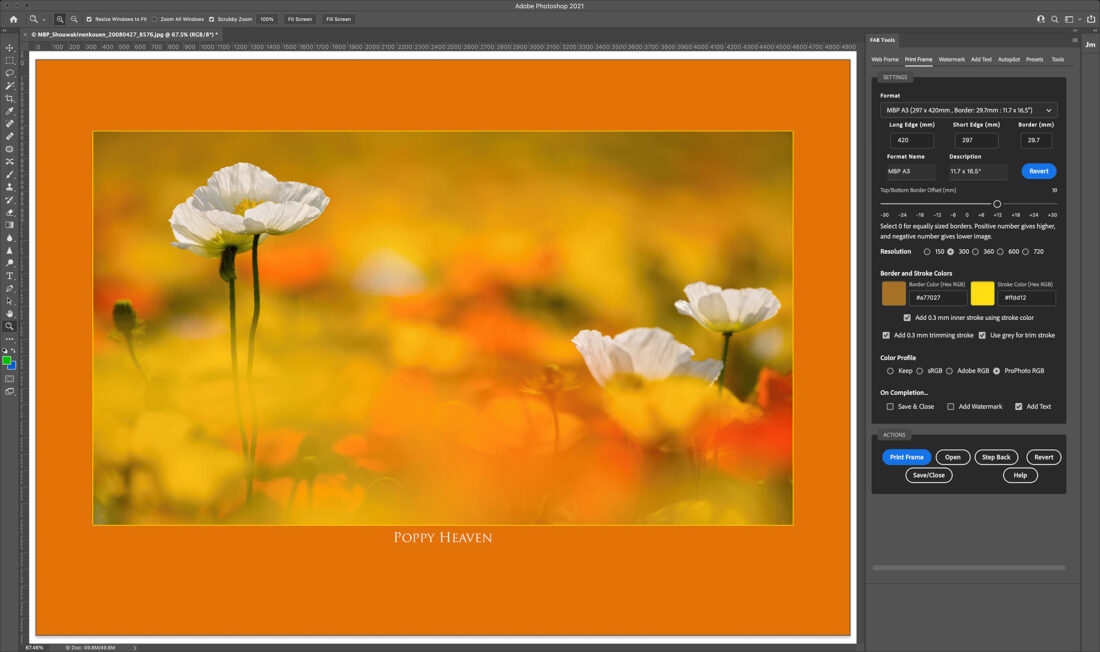 Version 1.3 of the MBP Fine Art Border Tools brings the ability to Color Your Frame, as well as Automatic Text from image info and saveable presets!
