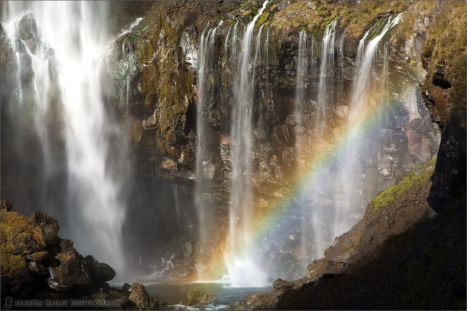 So back to the luck element I wanted to talk about here. Of course, a rainbow under these conditions is not that surprising, although I’d not really thought of it. Still I felt incredibly lucky. This feeling was confirmed over the next five minutes or so, as the rainbow was moving across the front of the falls as the sun moved across the sky, and was only visible for a very short time in the position you see in the photograph. It moved quickly to the right and then disappeared behind the rocks.