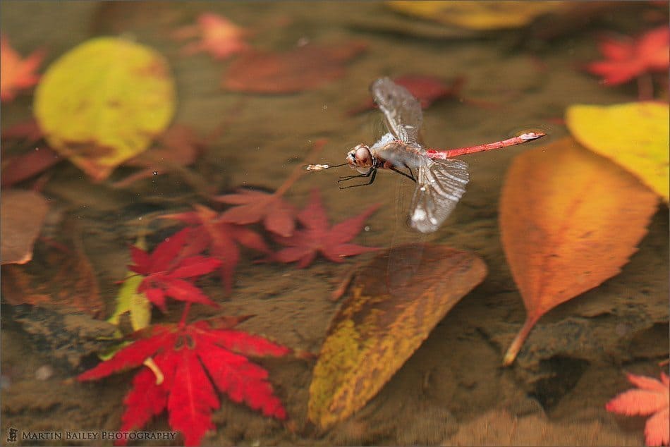 First I’d like to talk about a technical decision I made to place a polarizing filter on my macro lens when shooting a drowning dragonfly recently. I had just knelt down to photograph a red maple leaf that was floating in a shallow pond in a park. A moment later a red dragonfly plummeted into the pond. I immediately recomposed to capture the insect as it grappled its way up onto another leaf floating on the surface in a bid to stop itself from drowning. I realized that there was a lot of reflection on the surface of the water at this angle, and so reached into my bag for a polarizing filter. PL filters are often used to intensify a blue sky or to take the sheen off a glossy surface such as painted objects or even leaves on trees. PL filters also work as well to take the reflection off the surface of water to allow us to see clearly into the water.