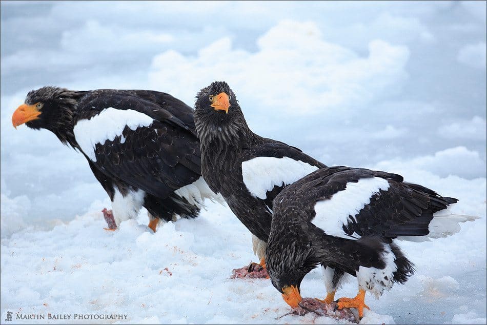 Take a look at shot number 914, in which you’ll see three Steller’s Sea Eagles standing on the drift ice eating fish scraps. The boat is basically chartered by photographers for the sole purpose of photographing the sunrise and the eagles, and they take a number of plastic trays full of fish and squid scraps out with us, and throw it out onto the ice. This attracts literally hundreds of eagles and gulls that gorge on the free feast.