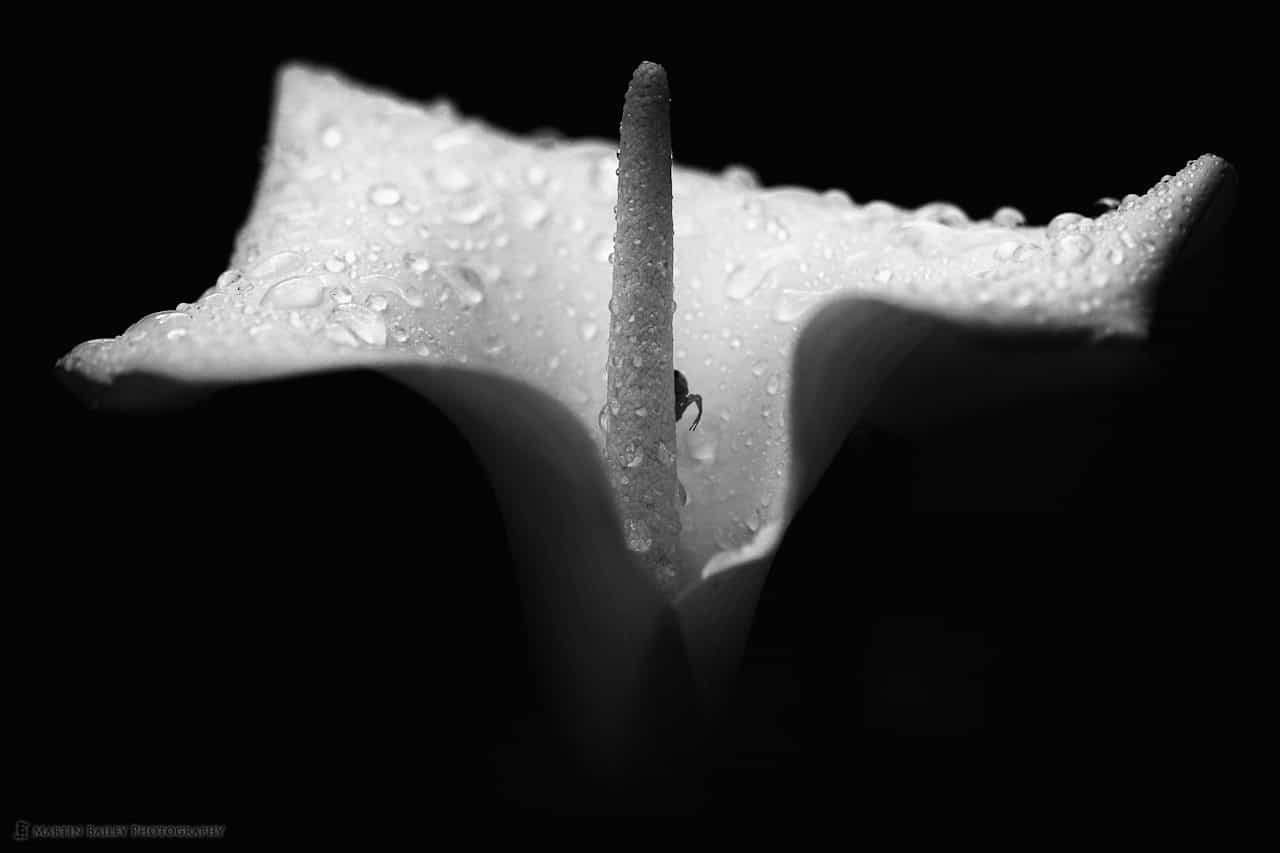 The next shot is another peek-a-boo shot, of a white lily with a small spider peeking around the center stamen. It is image number 428 and was shot on the same day as the last shot. I like this shot as the raindrops that had and continued to fall on the flower head are still quite large. The left hand side of the petal has enough depth of field at F2.8 with my 100mm macro lens, to be able to see some pretty sharp droplets, and yet the focus falls off pretty quickly to the front and back of that area, helping to focus our eyes on the large droplets. I had set the ISO to 400 and was getting a shutter speed of 1/20th of a second, even at F2.8, so you can appreciate there was still not a lot of light around. Needless to say I was using a tripod now at this focal length. If I remember correctly, on this for a while here my better ‘alf was holding the umbrella for me as I was crouching or kneeling down for this, but she got frustrated as her arm started to ache, and pass the brolly back to me shortly after shooting this. So another tip is don’t rely on anyone to hold your brolly unless they are your assistant and you’re paying them an hourly rate. Otherwise you’ll end up in an argument or at the least find that the person will probably not accompany on any more walks in the park on a rainy afternoon.