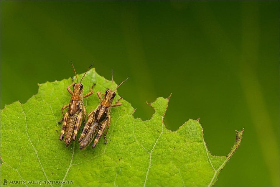 First let’s take a look at image number 1041. I want to briefly talk about a technique for shooting living things here that I recall from a nature documentary years ago, probably on the National Geographic Channel. I wanted to get in close on this pair of grasshoppers sitting together on a leaf. The position of these two guys just sitting together on this big leaf, looking like they’re contemplating either jumping off, or maybe just enjoying the view from the leaf in the warmth of the morning, was just too good. The first thing I thought was that I’d like to try a shot from around this distance so that you could see their environment and the fact that they are sitting on the leaf peering out across their green surroundings. The thing was though, they may well jump away startled if I just come right down on them with my 100mm Macro lens. So the first shot I took was from about twice the distance. If they jumped as I moved closer, I’d at least have a shot, and I could probably crop it to what I wanted. The next step, I moved to around this distance, and they didn’t jump, though the left one moved slightly, obviously aware of and uncomfortable with my presence. I got the shot though. Next, I tried to move in even closer, but the grasshopper on the left turned to one side. She didn’t jump away yet, but she turned away.