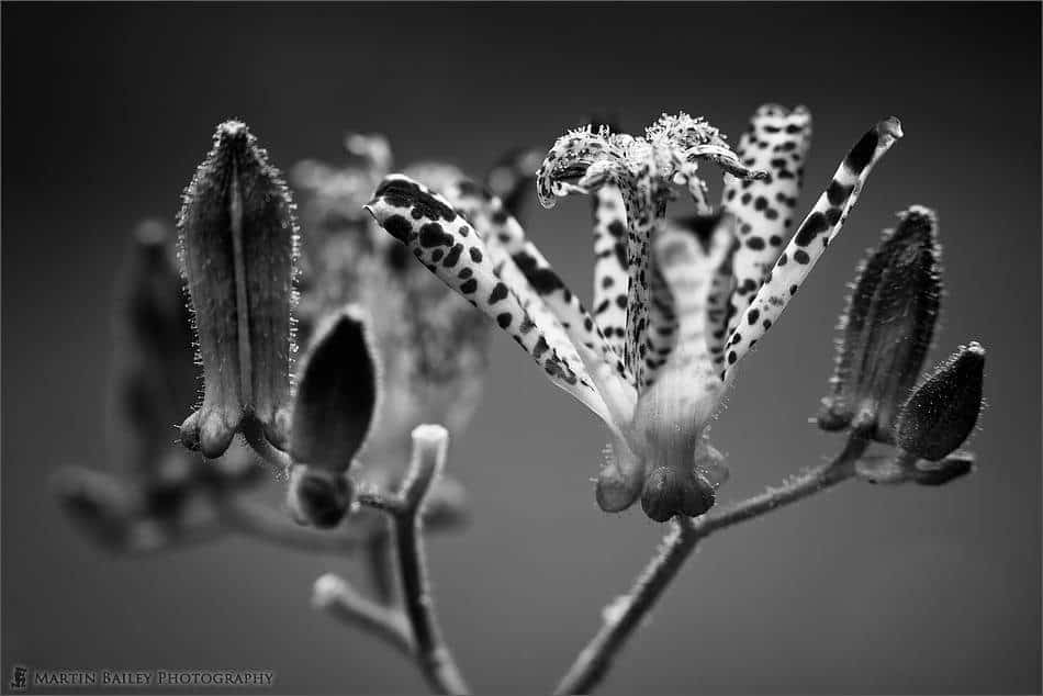 Recently I shot an image while walking in a local park on a Sunday afternoon. I don’t really want to focus on the image so much today, but let’s take a look at it to help me explain. It’s image number 1151. If you’re new to this Podcast, you can listen to Episode 0 to find out the various ways to view my images, including by using this number. I wasn’t all that thrilled with the image when I shot it. The flower which is by the way a “Hairy Toad Lilly” is quite a pretty flower, with white petals and reddish purple blotches of colour. This was a 1 second exposure at F5.6, with a tarmac path in the background and some trees behind that. At this focussing distance with my 100mm Macro and a 25mm extension tube, the background is thrown completely out of focus, so it was not distracting, but it was not interesting in any way either. I usually try to include some other foliage and sometimes other flowers to add blotches of colour in my macro shots, but the angle I needed to shoot from didn’t allow for this on this occasion. I started thinking that the uninteresting background, and even the colour of the flower itself was adding nothing to the shot might look better in black and white, so I decided to try the “Grey Scale Mixer” in Lightroom. As I moved the sliders around the image just came to life. It’s incredibly easy to get great effects by adjusting the red, yellow, green, cyan blue and magenta sliders. When I’d got something I liked, I also tried changing the white balance of the shot with the slider. Of course, because the image was now greyscale, it did not make the image look warmer or cooler, but because the underlying image would have looked much warmer if it wasn’t grey scale, this had a huge effect on how the black and white image looked. If you’ve not tried this in your black and white conversions, I suggest you give it a try.