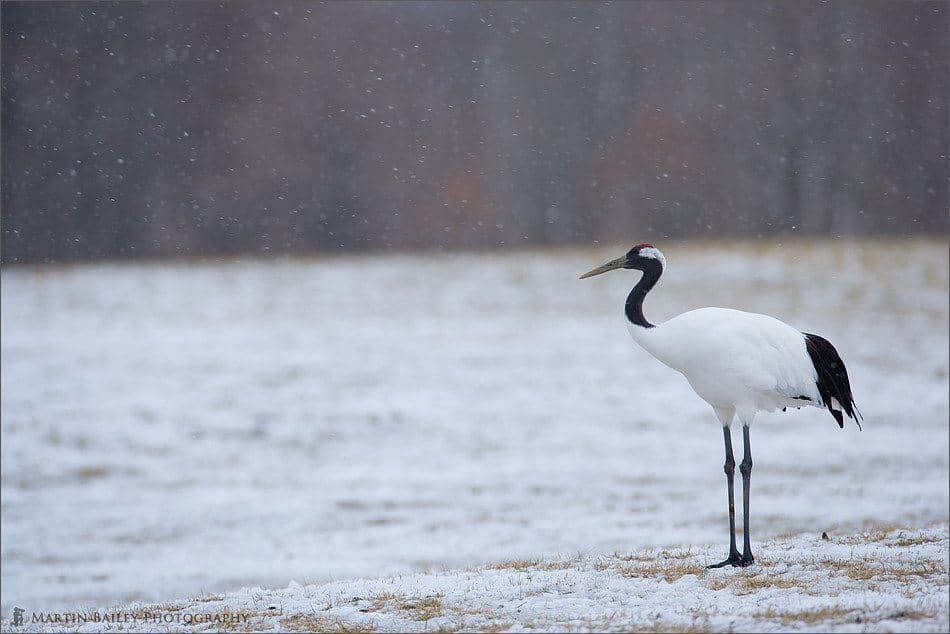 So, as with the previous day, I went to the Sanctuary for an hour before going back to the hotel for breakfast. Not cold enough to freeze the birds breath, I continued shooting anything that I thought might work out. I’d been there for a while when I shot image number 1225. This is one of the sort of shots that I mentioned last week, where the bird doesn’t really have to be doing anything to still play its part in the shot. It was snowing a fine light snow, and this crane was just standing there on one leg, bearing the cold, and surveying its domain. With the 600mm lens, I could frame the bird in the bottom left, and still get lots of that tree that adds a nice element to the shots of the Sanctuary. I thought about grabbing the 100-400mm lens and composing this a little wider, but didn’t think it necessary. This way, I get to frame the shot with roughly the same amount of space from both the crane and the tree, to the edge of the shot. The slowish shutter speed of 1/80th of a second allowed for some movement of the snow to register, making it more prominent, so we can kind of feel the cold and bleakness of the scene. There were a few blades of grass from where I was standing for this pre-breakfast session on this day, that have snuck into the bottom of the frame. Because they were quite close and I was shooting at F5.6 giving me a very shallow depth of field, they appear just like shadows and not really that annoying, but I think I’ll probably remove these at some point, just to clean the shot up a little. I’m not too bothered about cloning out something like this, as long as it doesn’t really interfere with the main subject or overall feel of the shot. One other thing to note about this shot is that there had been other birds walking across the ground between the bird in the foreground and the tree. I had to wait a while for them to move out of the shot before I could capture this one. I recall hoping that the bird we see here didn’t move as well as the others made their way to the edge of the frame.
