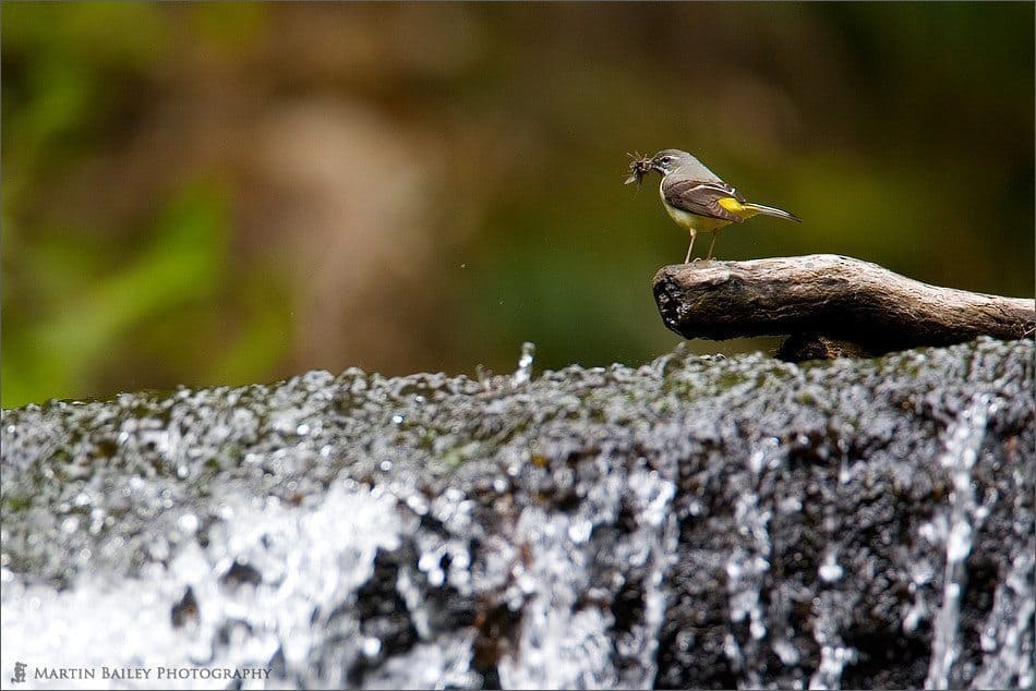 Let’s just look at one more image of the Wagtails before we move on, and that is image number 1449. Here we see one of the parents sitting on a log on top of the falls, with its mouth full of flies for the young in the nest. It always amazes me how these guys can continue to fly and catch more flies while already having so many in their beak. Still at ISO 400, I had set a shutter speed of 1/320th of a second here, as there was a little more light up here on top of the falls at this point in time, and I was trying to stop the white of the water from blowing out too.