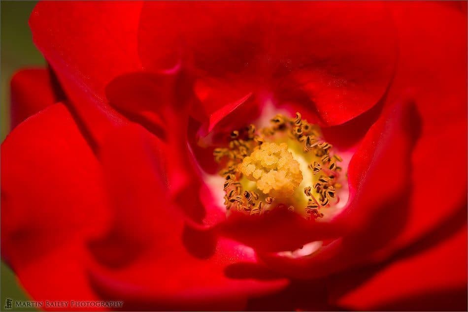 Let’s look at image number 1551, which is the center of an incredibly red rose. Here I’ve concentrated on capturing the amazingly vivid red of this rose with as accurate exposure as possible, and focussed on the stamen and bits and bobs in the center of the flower. Without doubt the theme for this particular image is the colour red. It just screams out to us, but as we’ve mentioned before it can be difficult to capture this kind of vibrant highly saturated red without blowing out the red channel. The trick here is to use an RGB histogram if your camera has it, and meter for the highlights, as we’ve mentioned before, but really be careful not to allow the red channel to actually touch the right shoulder of the histogram, meaning that it would be over exposed. You can quickly kill all detail in the reds by going over without realizing it. I was shooting in Manual Mode so I can’t tell you how much exposure compensation you need to apply, but really just keeping your eye on the histogram is the key to capturing this colour correctly. It was really bright day as you can probably tell from the image, so with ISO 100 I was shooting at 1/500th of a second with an aperture of F4. You can tell that the colour is perfectly exposed because the detail is visible in the petals for all areas that are in focus. The reds do merge into a smooth block of colour where the flower is outside of the depth of field, but that is perfectly normal. Getting the main parts in the center of the flower sharp help to keep the shot sane in this sea of colour, and on this occasion I’ve included part of the edges of the flower to give us a reference on the size of the flower head.