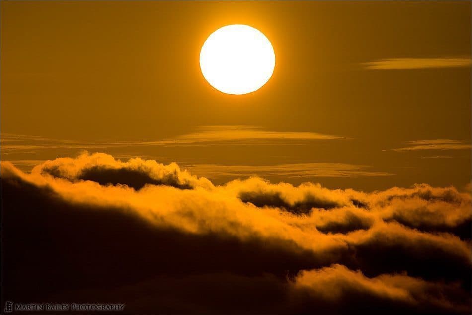 I started to shoot as the light from the sky illuminate the valley, and made a few shots of the trees on the edge of the clouds, some later ones of which we’ll look at later, but then at around 6AM the sun broke over the top of the clouds, which was pretty nice. Let’s look at image number 1568, which was shot at literally one second after 6AM, a few moments after the entire sun’s disk became visible. Here we can see the sun shot through my 600mm F4 lens, at ISO 100 for 1/8000th of a second at F8. This is the fastest shutter speed the 5D will give me, so I had started to stop down the aperture to keep the clouds from blowing out too much. Of course with this much light, it would look more unnatural to not have anything blown out than it would to get everything correctly exposed. Of course the sun’s disk is blown out too, but that’s par for the course. Having a lot of fun in these first few hours, I did continue to play around and got one or two images just of the sun’s disk, where the sun was not very blown out, which was pretty cool to look at, at 100%, but as a photograph it didn’t really warrant uploading to my online gallery. In this one though I was pretty pleased with the formation of the clouds etc. and just thought it was a fun shot to upload and share with you today.