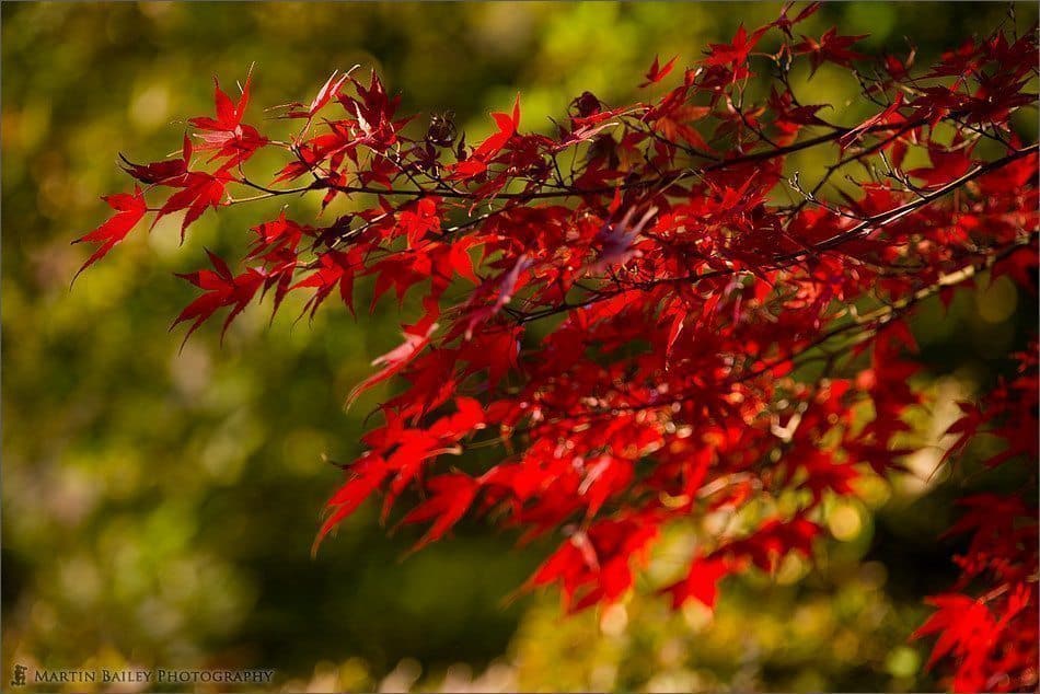 Take a look at another autumn foliage shot, in number 1631. The beauty of a long lens like this is that it allows us to get in close from a distance, editing the scene in camera, removing unwanted elements to isolate the subject we want to concentrate on. Here I found a patch of leaves with a nicely lit second patch in the background, and was able to compose the scene in this way because of the focal length of the lens. I stopped down to F4 for this shot to give me more of the foreground leaves in focus, while still throwing the middle and background patches nicely out of focus for the overall effect that I was hoping for.