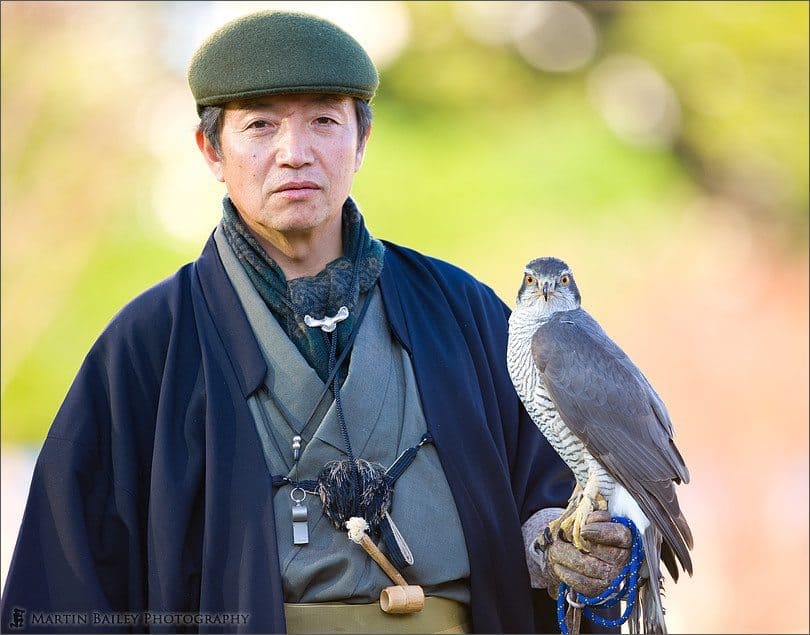 Next, in image number 1674, we see one shot where I actually managed to sit down and shoot through a gap in the people in front of me with my 300mm lens. Because I could sit down, the blue netting in the background is out of the frame, allowing me to get a nice portrait of both the falconer and his bird, and they are both looking right at me. I get the distinct feeling that he’s looking wondering whether I’m shooting him or not. This is the part of the show though after they’ve done all their stuff and ask you to come and get your photos, so there’s no worry about me shooting this portrait. The background is a little bright, as the man was in shadow, but that doesn’t worry me too much. It’s nice to see the little falcon decoration on his bootlace tie, and the whistle and other paraphernalia associated with falconry, again though, intermingled with Japanese traditional dress. Like I say, I shot this with the 300mm, and it was wide open at F2.8, with a shutter speed of 1/160th of a second, ISO 100.