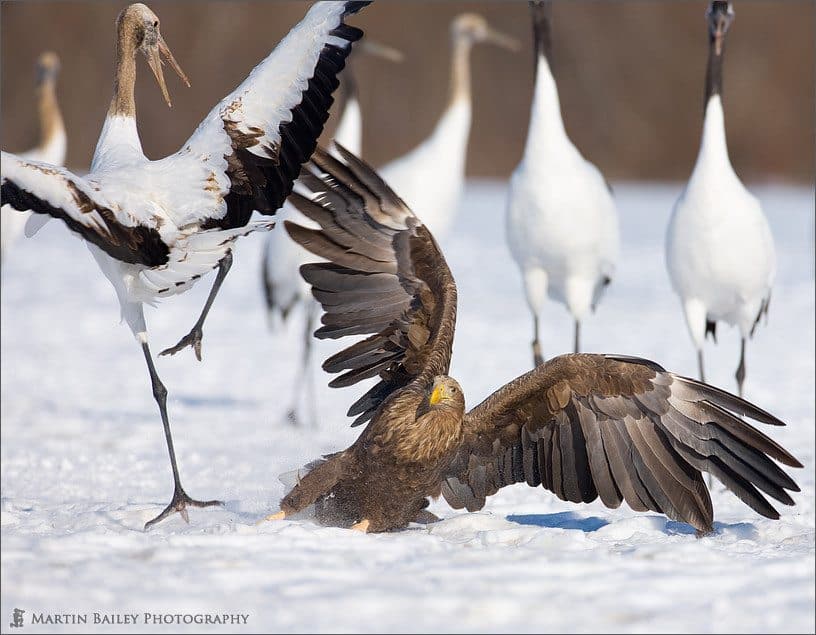 In shot number 1688, we can see one of the White Tailed Eagles navigating a low flight through the cranes, many of which turn to keep their eye on the eagle as he makes his way through their turf. Andrew, one of the participants, made a comment about this image in my gallery, so I thought I’d go into a little bit of detail on how I focussed for this shot. Firstly, I should say that I set the custom function on my camera body to toggle between One Shot focusing, and AI Servo when I push the AF Stop button on my super-telephoto lenses. This is the small black rubber button near the front of the lens. In my arsenal only the 300mm F2.8 and the 600mm F4 have this button, so this advice will only be of limited help in itself, but basically what I did was held the button down, switching me to AI Servo while I was panning around with the eagle in the sky, as in the previous shot. Of course though, there is a good chance that the focus will be stolen by one of the cranes as I moved through the group here, so I released my finger from the button, which threw me back into One Shot focusing to prevent any unwanted searching, and allowed me to lock focus easily as I panned along with the eagle, getting just him perfectly sharp.