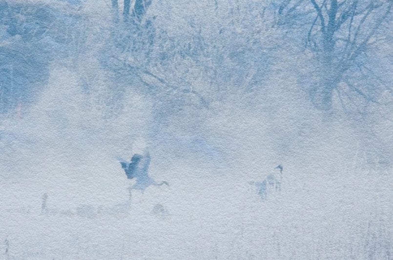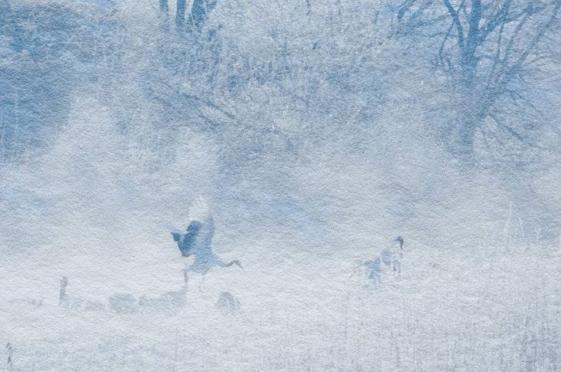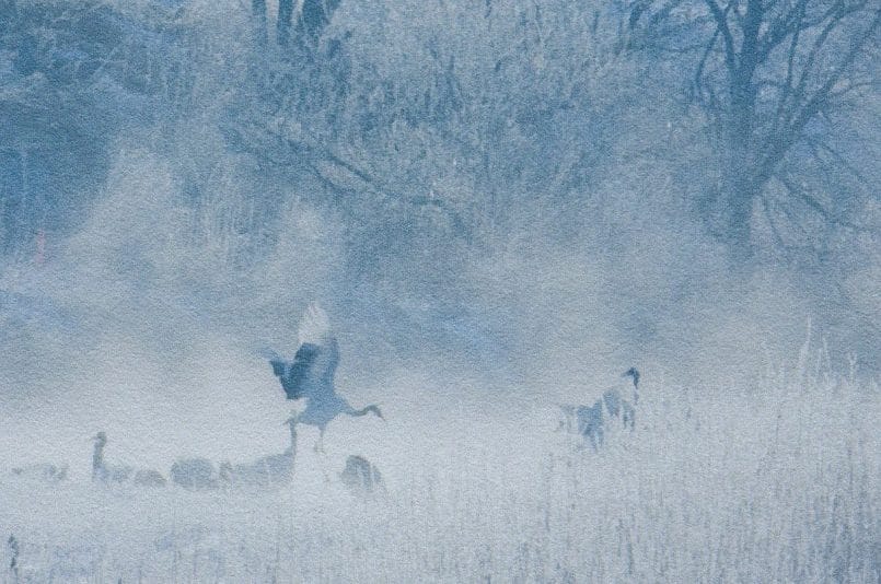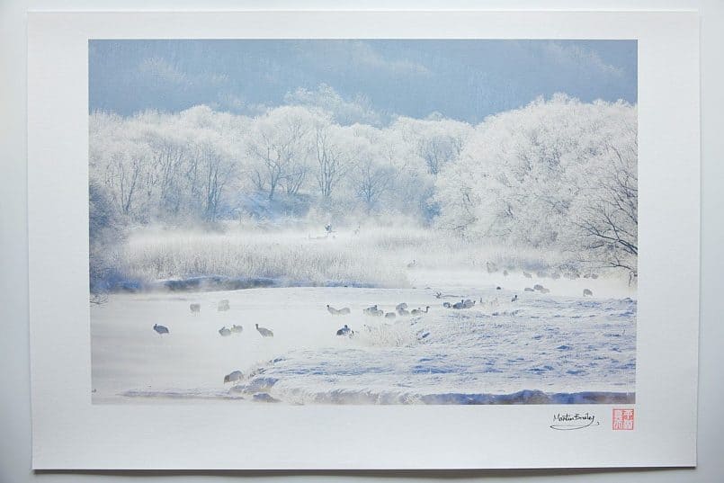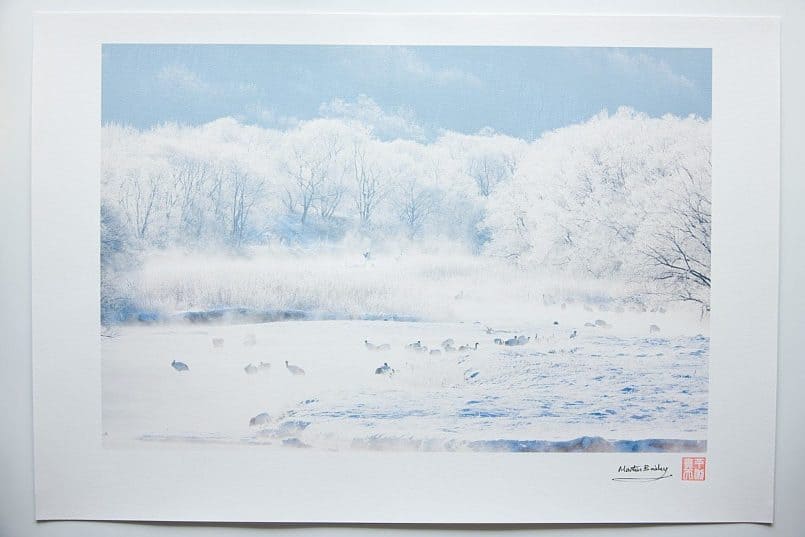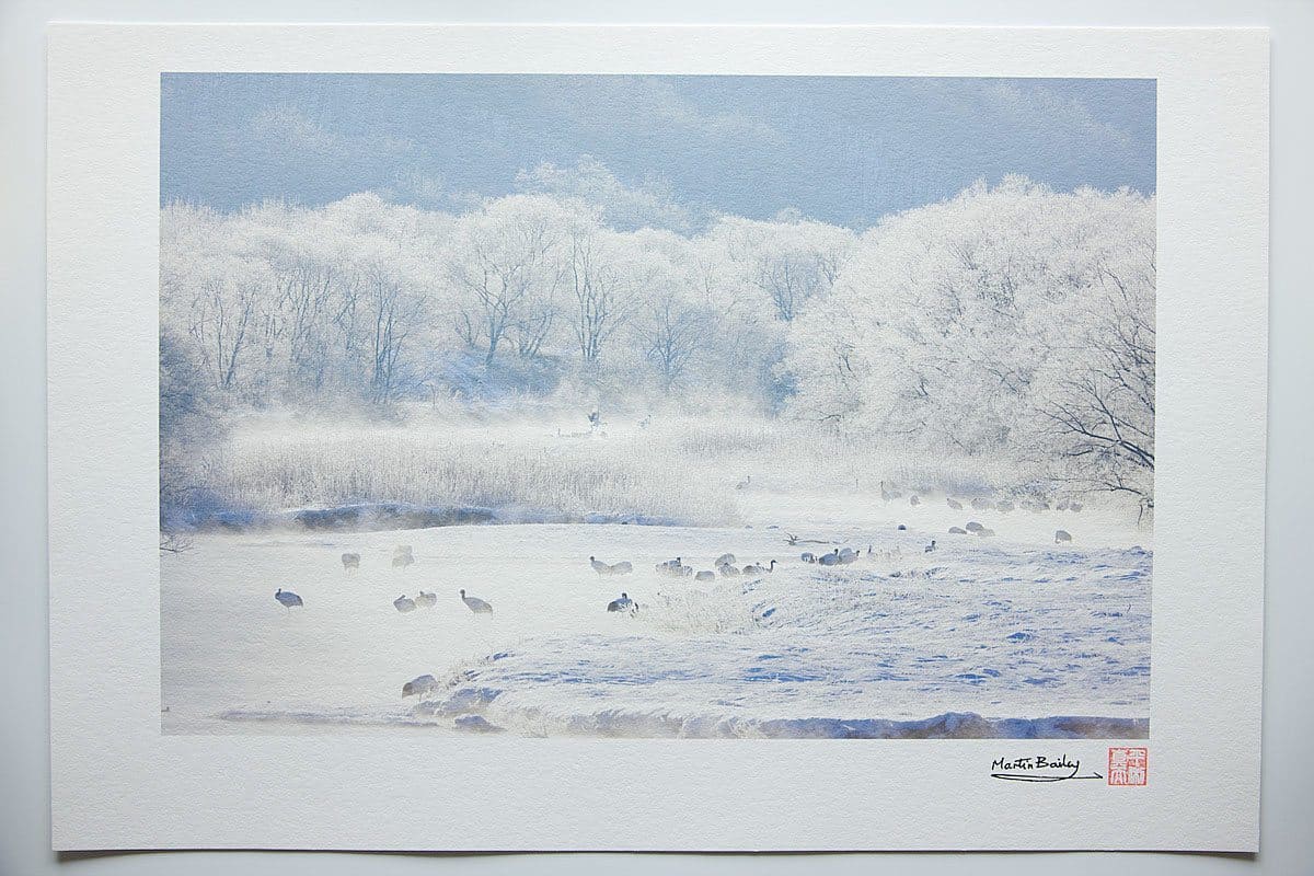 The first thing I did was to print that image we just looked at, with all the green in the background. I printed to both the Canon Fine Art Photo Rag and Museum Etching Fine Art papers, with Matte Photo Paper selected in the printer driver, with color management turned off, and the Rendering Intent set to Perceptual in Lightroom, and the Hahnemuhle profiles selected. Both came out perfect, with no color casts and as sharp as I could wish for. I finally started to feel as though I might be able to use this printer without uncertainty. Over the last week, after figuring out that this was possible, and my first few prints looking very promising, I did a few more experiments to make sure this was really working. My favorite print at the moment is of the cranes in the river in the morning mist during our Hokkaido Workshop in January this year. (Click on images to view larger, and use your keyboard arrow keys or mouse to navigate through images.)