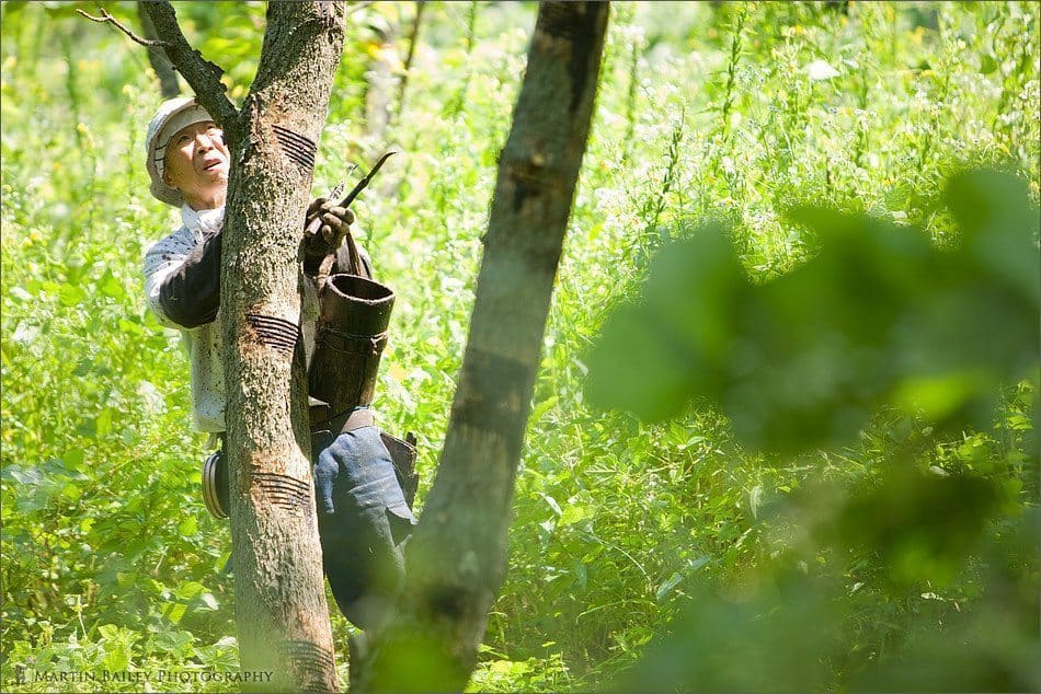 Let’s take a look at the first picture for today, which is image number 1874. You’ll probably be amazed when you see Omori-san with his leg wrapped around the urushi tree to stop himself from falling, that he has been doing this job for 53 years. When you consider that he was 13 when he started, that makes him 76 years old. I just hope I’m even half as agile as this when I’m 76, if I’m still alive that is. This first photo was shot on the first morning. I’d met Omori-san at 6AM, and drove out to a patch of the urushi trees with him. There were to be some other visitors on this day too, and I wanted to make sure I got my shots. I had a list of types of shots the client wants for the book, and I had two days to try to capture them. The other instruction was to just shoot as much as I can, and the client would possibly change the composition of the book, depending on my results.