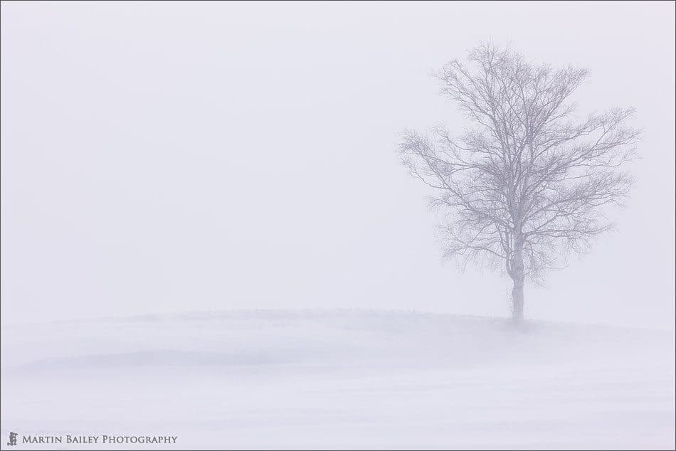 This tree doesn’t have a name that I was able to find at least, but many of the trees in the Biei area are actually named, like the Parent and Child trees that we can see in image number 2184. These are shot from the same place at the last image. I don’t think I even uprooted my tripod for this. You just have to spin around about 90 degrees to your right. The base of these trees is hidden slightly by the hill on which they stand, and at this time of year it’s pretty much impossible to get to a location that you can shoot them without that being the case. I still like the resulting image though, with the driving snow again whiting out much of the scene, leaving just daddy tree on the right, mummy tree on the left, and junior in the middle. There is just a tiny bit of texture and gradation in the foreground, but again, a very minimalistic look here. Another reason why I had to clean my lens so many times here was because there were only certain times where you could see the trees this well. Some of my shots were literally totally white, as the snow obscured the view of the trees totally.