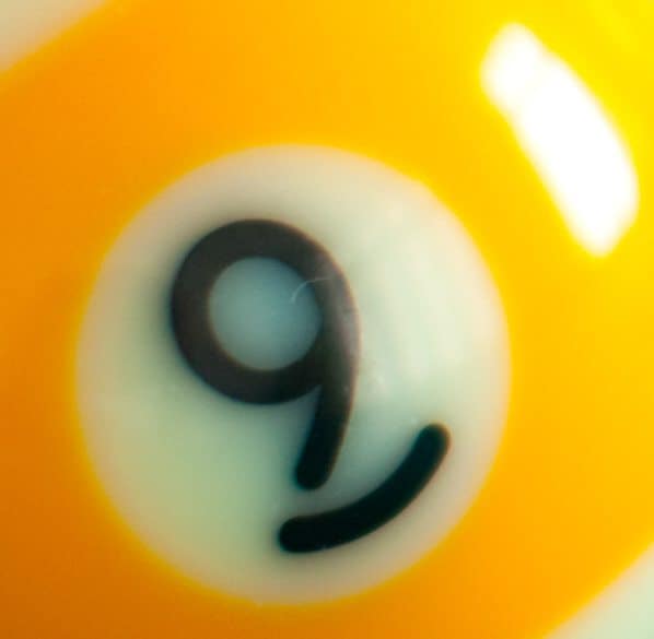 I wanted to make sure that the Lensbaby Composer was sharp at F2.0 as well, so I took at look at the nine-ball at 100% (below). You can see that the lines around the black nine are very sharp, although you have to bear in mind that these balls are maybe not the best subject to prove this with. I shot this at ISO 400, so it’s just a little bit grainy, but you can certainly tell that the sharpness is there. For a lens of this price, I have to say I’m still very impressed with the image quality.