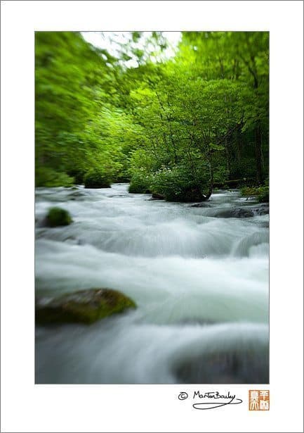 The last example image that I wanted to look at is of the Oirase Mountain stream itself, in image number 2314 (below, right). Here I was standing with my tripod legs perched precariously on three separate rocks, with the camera standing over the fast flowing water. Probably not the best spot to change out lenses, but I decided to try a shot of this with the Lensbaby before I moved on. Again, using the F11 aperture ring, I think I also held an ND8 neutral density filter in front of the lens here to give me a 4/5 of a second exposure at ISO 100. I may have done that for the last shot as well, but I’m not sure. Anyway, again here the large sweet spot has given us lots of the scene in focus, but the outer edges are all blurry, giving us a nice creative feel to the image.