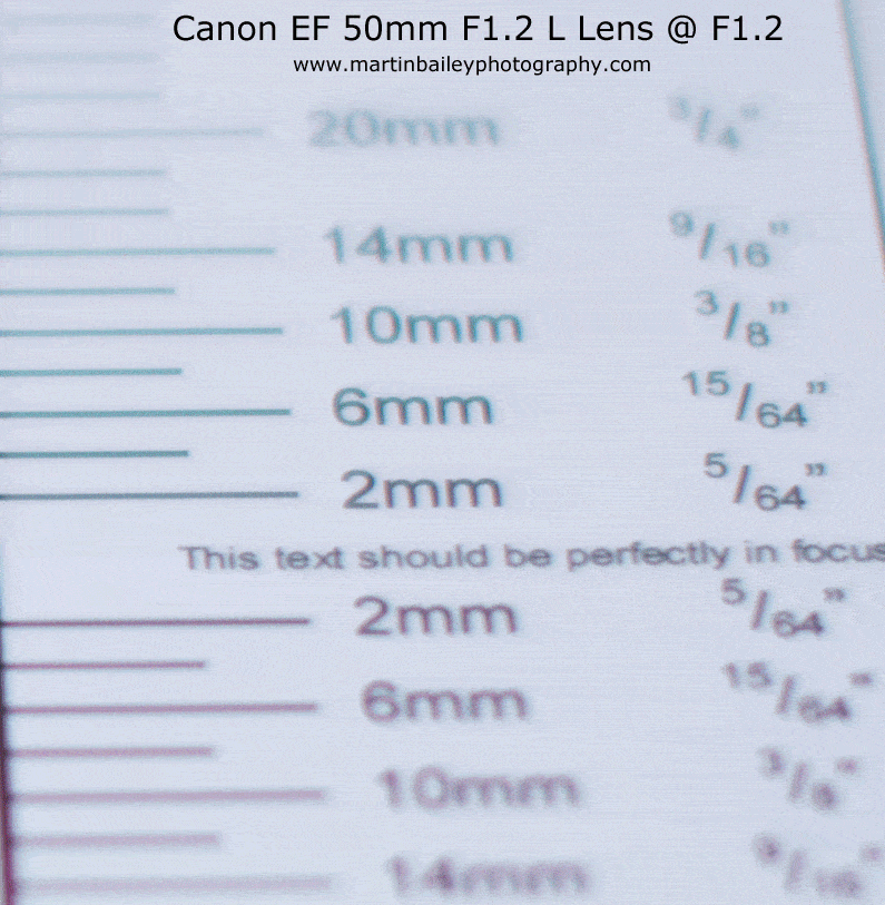 As you can see, despite the fact that I focused as closely as possible on the thick black line on the chart, which is the same distance from the camera as the text that says “This text should be perfectly in focus” in this crop, the text starts to sharpen up from the back “2mm” text. Then the depth-of-field continues to increase backwards, and doesn’t really come forward to sharpen up the front “2mm” until we get to around F8.