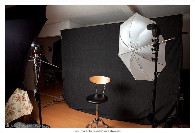 The umbrella to the right is a 45″ Photoflex convertible umbrella, with the black cover removed, and the strobe putting into the umbrella, basically shooting through it. This provides quite a strong light source, but relatively soft as I place it as close to the subject as possible, without it getting in the way of the photograph. The further away you move the light source, the smaller it gets in relation to the subject, and the harsher the light will get, because it doesn’t wrap around the subject as much as it does when it’s close to them. Note that I have the Canon Speedlite 580EX II on the right light-stand, and I have mounted it sideways, with the infra red window pointing towards me, then I have turned the flash head back towards the umbrella. This is to give me the best line of sight from the Canon ST-E2 Transmitter that was mounted in the flash shoe on my camera. Also note that I turned the power of this right strobe right down for this image, as there was too much contrast to make this photograph otherwise. All you could see was this one umbrella and everything else was dark.
