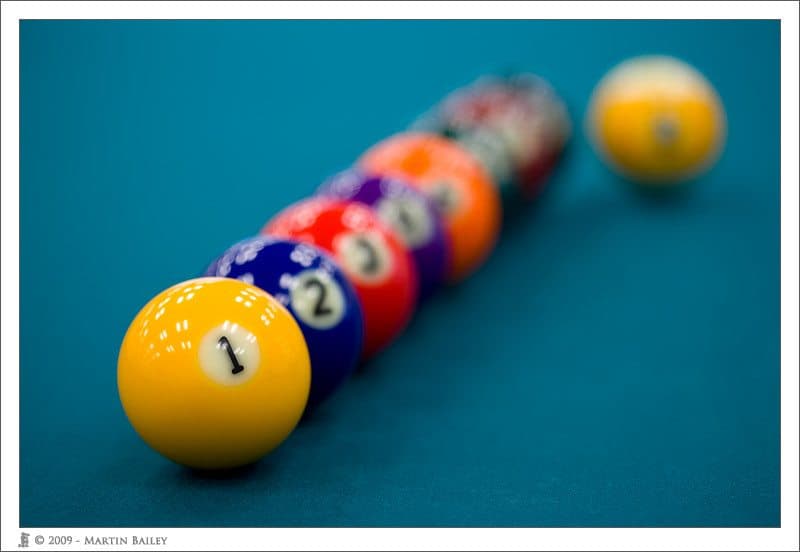 So, the first thing I did on Friday when I got the new lens was to set up a test shot. I haven’t done the test chart shots yet, though I’ll try to do that within the next week or so. What I did was lined up nine billiard balls, and shot them with both the new 100mm F2.8 IS macro, and my old 100mm F2.8 non-IS and non-L macro.