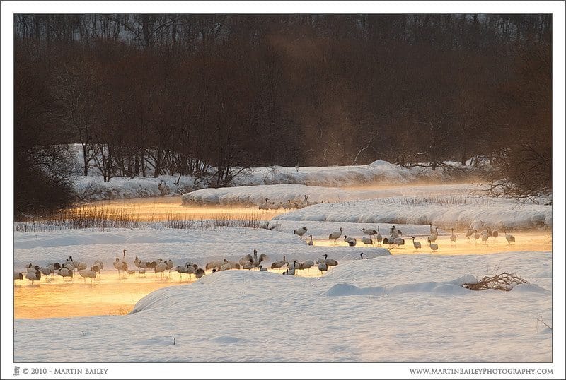 This is the first crop factor camera that I’ve owned in over four years, since I bought my 5D, and sold my 20D. The Canon EOS 1D Mark IV has an APS-H sensor, which results in a 1.3X crop factor. This isn’t as large as the 1.6X crop factor that my old 20D which had, but it still took a little getting used to again. A number of times I found myself reaching for the 300mm f2.8 and having to drop down to the 70-200mm F2.8 lens, because the 300/2.8 was a little too long, with a 390mm effective focal length. Once I got used to it though, I did like the additional reach that the 1.3X crop factor gives me, and most of the time for eagles etc. I just used the 300mm F2.8 L lens without the 1.4X Extender (Teleconverter) which gives me 420mm with the 300/2.8 on a full frame sensor camera like the 1Ds Mark III or 5D Mark II. I also enjoyed getting an effective focal length of 780mm from the 600mm F4 L lens too, when shooting down the river from the Otowa Bridge in the town of Tsurui, for shots of the red-crowned cranes in the mist, like below. Unfortunately, there was no frost of the trees this year, but still, a little mist rose from the river as the sun started to warm the surface of the water.