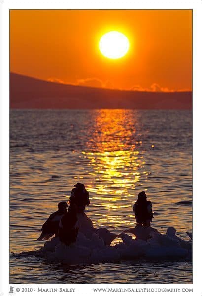 One situation where I did have a slightly lower hit rate with the auto-focus, was when shooting some eagles on a piece of stray ice floe (left). Here, a few of the shots jumped back to the sunlit ripples on the sea, because they were higher contrast than the almost totally silhouetted Steller’s Sea Eagles. This may well have been caused by a focusing error on my part though, as it was difficult to see through the viewfinder looking into the morning sun with an effective focal length of 390mm.