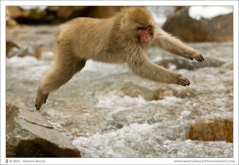 When I was in Nagano shooting the snow monkeys, a number of us perched ourselves on rocks near the river to try and shoot monkeys as they jumped across the stepping stones to cross the river. I shot maybe 30 frames, as a number of monkeys jumped across the rocks, and all but one were useless. At first, I tried AI Servo focusing, and tried to lock in on the Macaque as it approached the edge of the river, and while tracking it with the auto-focus, shot a series of frames as it jumped across the river. This wasn’t working, so I tried selecting the center focus point, with focus point expansion as necessary turned on, and this didn’t really help either. Eventually, I changed my strategy and focused on the last rock before the shore, and just waited for the monkeys. With that method of focusing, I was finally able to get one shot with the monkey’s face sharp, although I clipped the top of his head.
