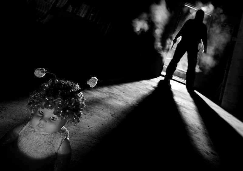 I did a few test exposures and wasn’t happy that I was blending into the door frame. I decided to light a few pieces of crumpled paper on fire and blew them out. I placed them in the shadow on the left side of the picture and the smoke slowly drifted out the door. I also lit a cigarette to add more smoke. I took a number of shots and finally decided I probably had a keeper. I was relieved that none of my coworkers stopped by because I didn’t want to explain what I was doing after hours with a knife, doll, camera and smoke was coming out of the warehouse. I was also happy the smoke detectors didn’t go off.