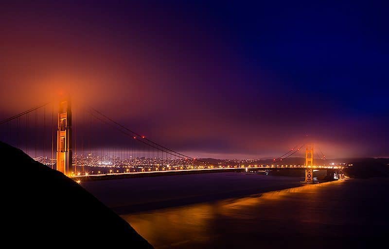 This is another amazing image from an amazing photographer, and a fitting back-story too. Thanks Forrest! I really like the view that you captured here, and the mist on the top of the towers really does add so much. The golden reflections on the water and the gold color of the towers really does make this amazing structure live up to its name. I’ve never been to the Golden Gate Bridge, but my brother bought me a silk wallet from their when I was small, maybe 8 years old, and I always wanted to visit after that. You image and eloquent description of your own feelings for the bridge has made that desire even stronger. Other things that I like about this image is the way the totally black negative space in the bottom left corner give us a nice anchor point for the bridge, and I love the way that is almost mirrored with the same sized triangle of deep purple in the sky in the top right opposite corner of the image. It really is a memorable image Forrest. Congratulations!