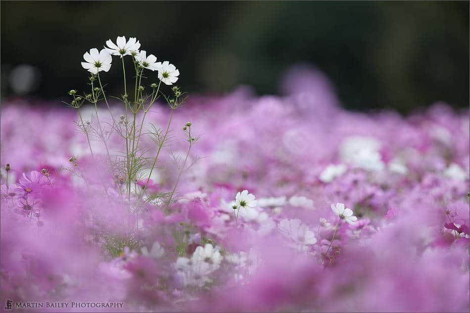 I’d actually bagged an image on October the 2nd that I figured I could upload if I couldn’t come up with anything better. Here’s my first attempt (left), which I quite like as a bookmark, but I wasn’t over the moon with it as a photograph. Since giving up my day-job, and putting so much time into setting up my new company, I’d continued to have a relatively dry month photography wise, but luckily I got out to a local park a couple of times, as the cosmos flowers were in bloom, and while I was there, I shot this image, and from the start it seemed to me that the four white cosmos that were facing away from the camera were reaching up out of the field of flowers, peering over at some other flowers on the other side of the field.