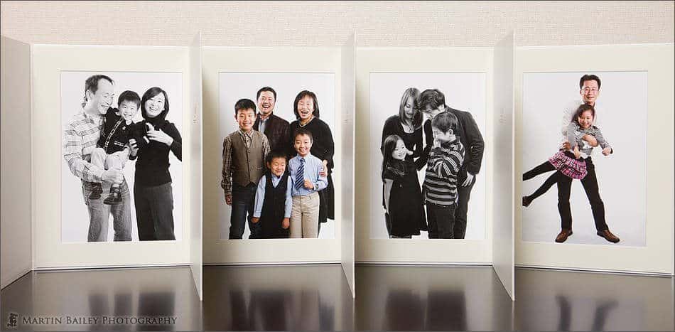 As I mentioned, eight of the nine families photographed opted for the package that included one A4 print created on Hahnemühle Fine Art Baryta paper. I snapped a few of the prints in the mounts that I used, as we can see here. For each family I created a Web gallery for them to look at and select the image that I would print for this.