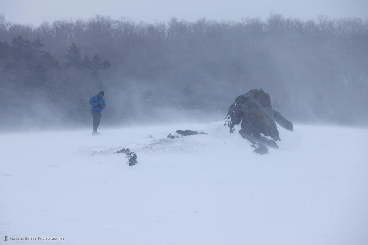 Once we got around to the other side of the peninsula, we shot the beautiful Oshin Koshin falls, but again, I’ve shot them so often that I didn’t include any shots in my final selection. Then, we headed up into the Shiretoko National Park for a walk through the woods and out to the Furepe Falls. I bring the group in here in search of Ezo Deer, but it’s also a wonderful place to get some stark landscape shots. Here we see one of the group members bearing the elements in the park, as snow is blown up from the ground by the bitter high winds.