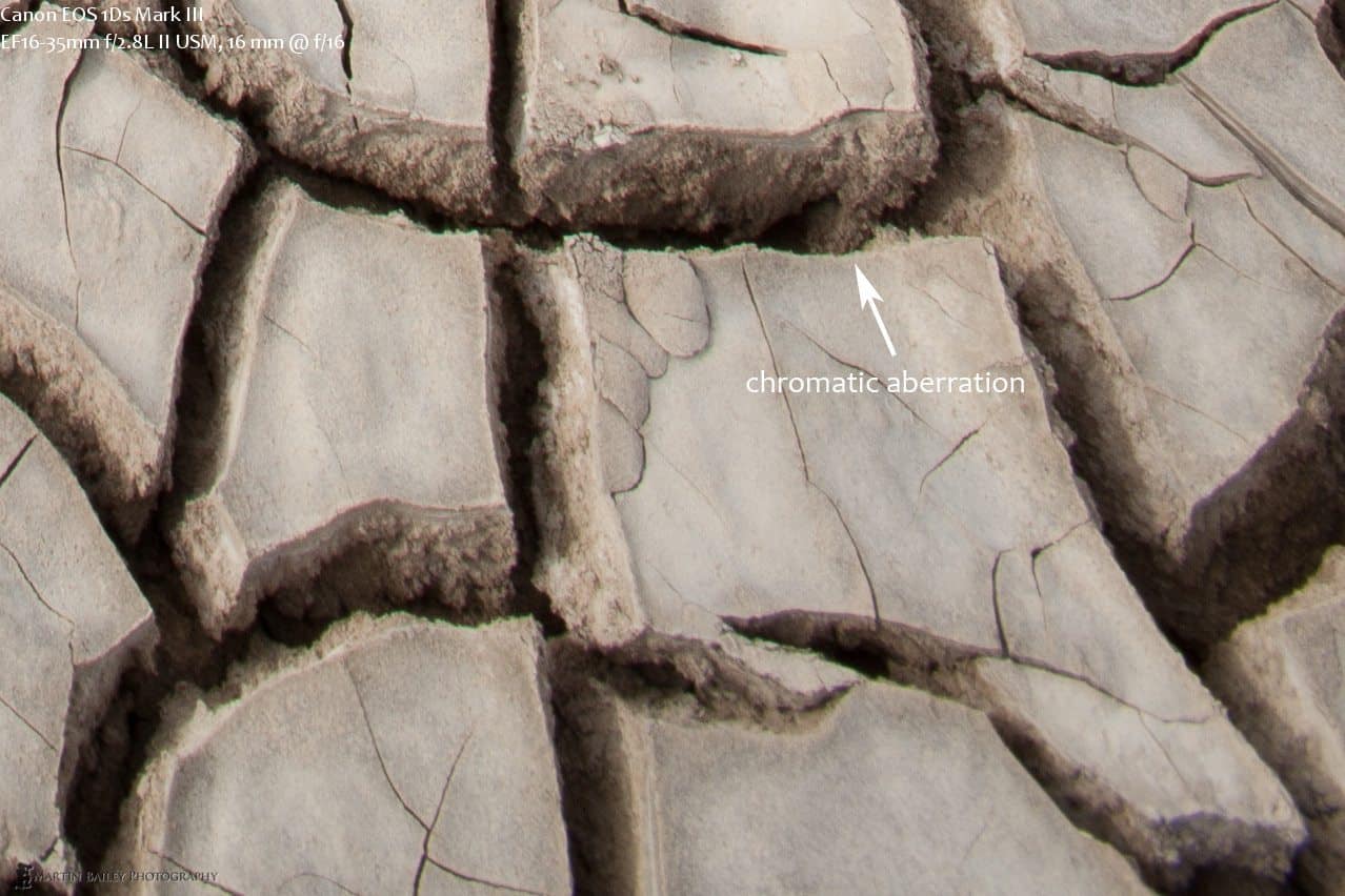 I shot this at 16mm with an aperture of f/16 and there was a little bit of softness and chromatic aberration in the foreground corners, and the mountains in the distance were a little bit soft too, as you can see in this image, which is a 100% crop from the RAW image in Lightroom. Make your browser window as wide as possible and click on the image to view it at full size.