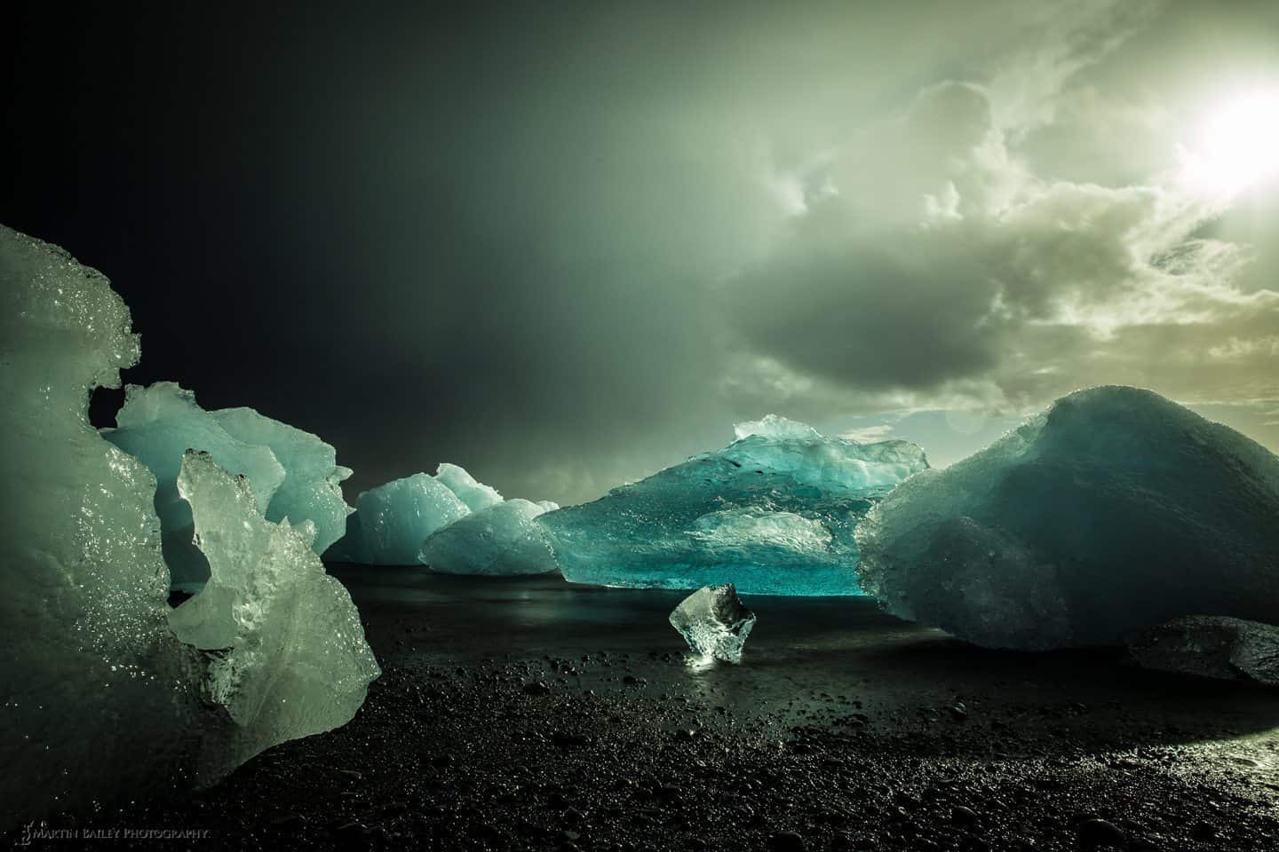 I looked at the images more closely on the back of my camera, and realised that the horizon of the sea over the top of the ice was distracting, so I lowered my tripod to about kneeling height, and as I started to make a few more frames, the clouds opened up a little, and the sun started to shine directly between the two large growlers on the right, illuminating the small piece of deep glacial ice in the middle of the group, and that started to reflect the light down onto the black stony beach like a prism. I couldn’t believe my luck!