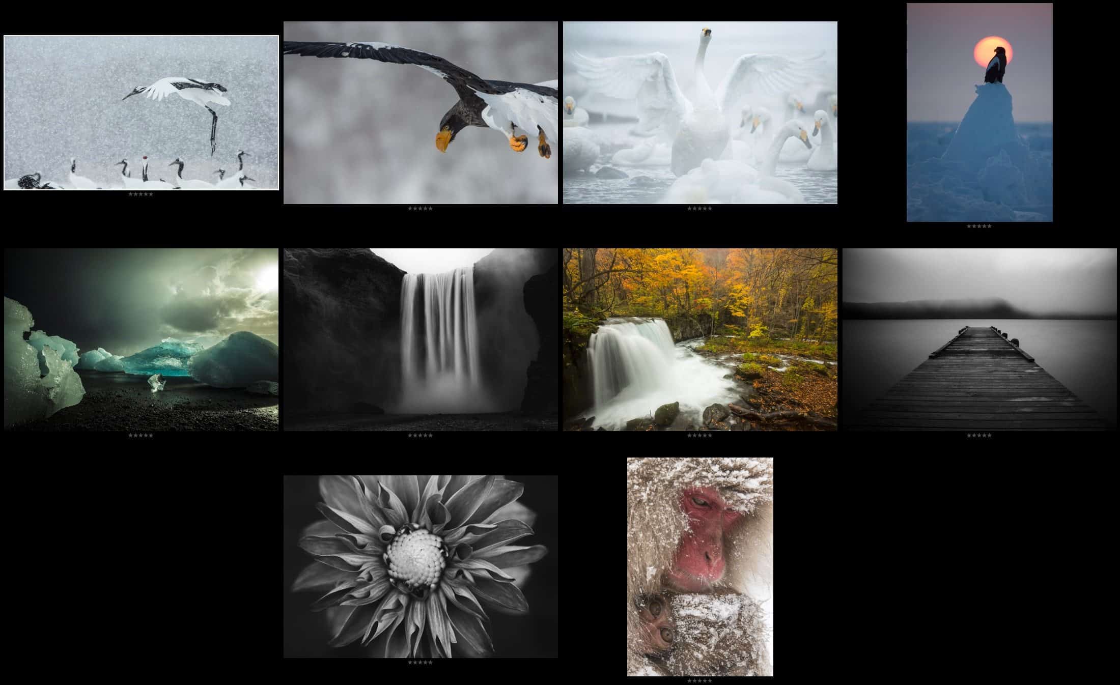 I started to look at duplicates. For example, I have two crane shots left, so one had to go. Two black and white flower shots left, so one had to go. I had a very similar shot to the waterfall on the right of the second row in last year’s Top Ten, so I removed that. I still had four waterfall shots so I removed the one on the far left of the third row.