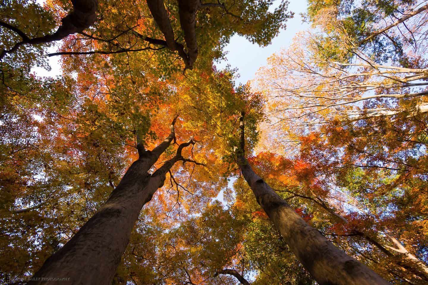 For this photo, I mounted the camera on a tripod, pointing straight up, and then with Live View turned on, so that I could see the photo to compose, I closed the tripods legs together, and pushed the camera up between three tree trunks, that we literally all right next to each other, and I released the shutter with a cable release. I fell in love with the way the 14mm lens distorts reality. The three trunks of the tree were really only inches apart, with barely enough room for the camera between them, but in this image, they look much further away from each other.