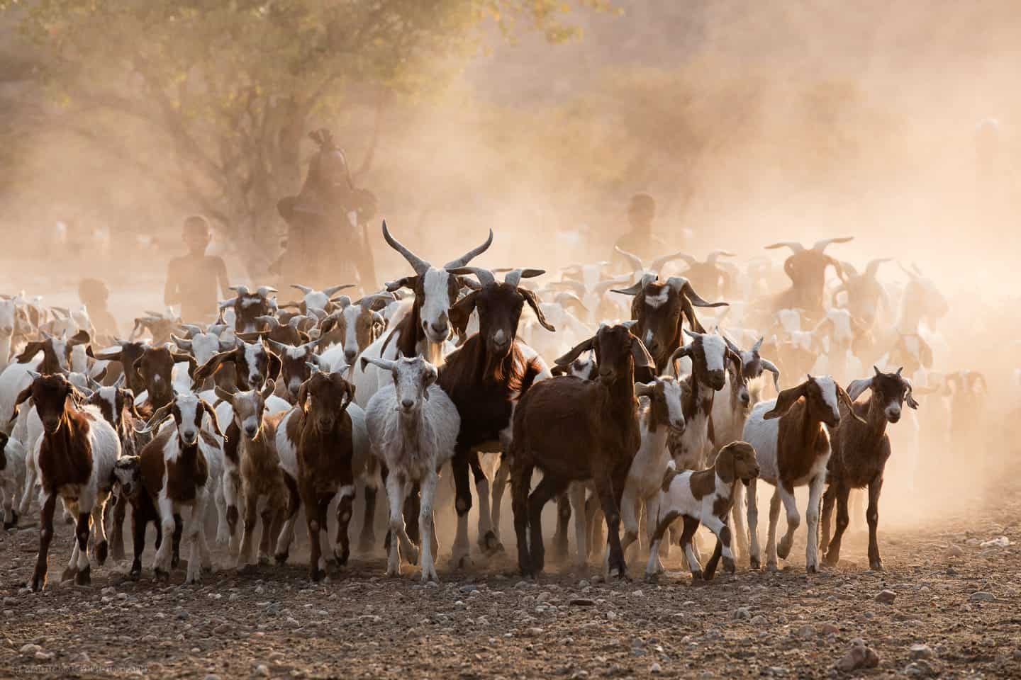 We continued shooting after this, as the Himba people kindly allowed us to photograph them herding their goats into the corral for the night, as we can see in this photo (below). The are hills behind this scene, so the sun goes behind the hill before it gets close to the horizon. This means that the light is getting warm, but not as warm as it would be later, if the hills weren’t there. There’s nothing we can do about that of course, and I still like the resulting photos a lot.