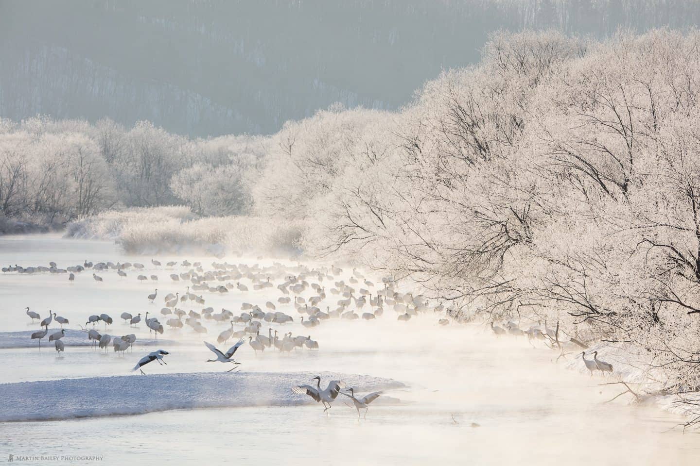 As I mentioned last week, we’d had some beautiful warm colored mist from the bridge on the first morning that we visited, but the ideal scene from that location is when the temperature drops below -16°C or 3°F, with no wind, and then if we’re lucky, hoar frost forms on the trees, making them turn a beautiful white. When we left the hotel on the second morning, for our second and last chance to see this phenomenon, it was just about cold enough, so my hopes were high. As the sun started to near the horizon and the light increased, we were treated with this scene (below) as the cranes started to awake and call in their river roost.