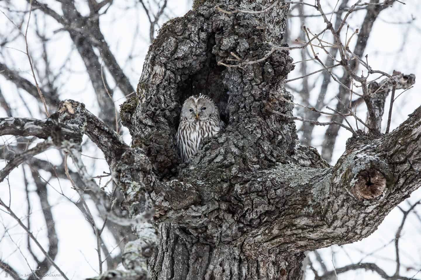 Because we had not found an Ural Owl on either of the nests that I know about the previous day, after a quick rest-room stop at the hotel, we took a 90 minute drive back to the nearer of the two nests. We were happy to spend that time too, as we were rewarded with photos like this one (below).