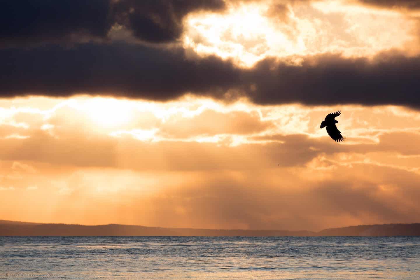It does mean though that as we photograph towards the sun, the exposure needs to be tweaked, but as suns rays started to form over the Kunashiri Island, I adjusted my exposure and got a few frames like this one, with a White-Tailed Eagle flying over this almost biblical looking backdrop (below). I have a number of these that I really like, although this is probably one of my favorites.