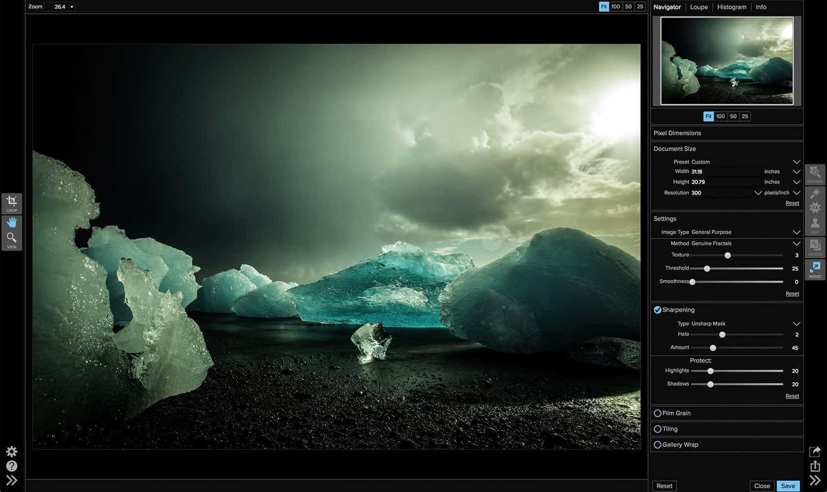 I’m not going to do a tutorial on this today, but here is a screenshot to show you the application, and the sort of settings that I select when enlarging an image for printing at just over 20 x 30 inches, for a 24 x 36 inch print with borders (below).