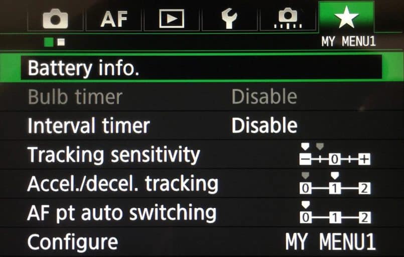 I also add the following items to My Menu. The main takeaway here is adding the Tracking sensitivity, Accel./decel. tracking and AF pt auto switching settings to this menu. This gives me easy access to these settings to tweak them as necessary for fast paces AI Servo shooting.